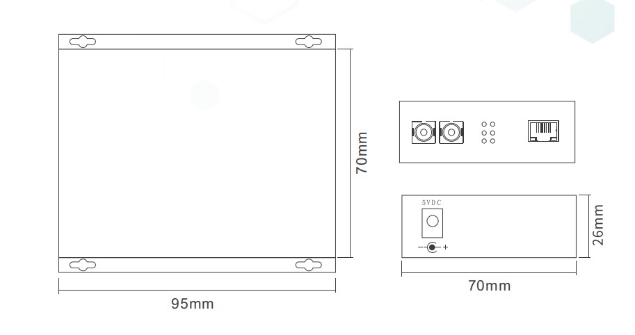 物理尺寸(宽×高×深):95mm×70mm×26mm(外置电源) 140mm×30mm×110mm(内置电源) 机箱外壳:金属外壳 安装方式:桌面式安装 |